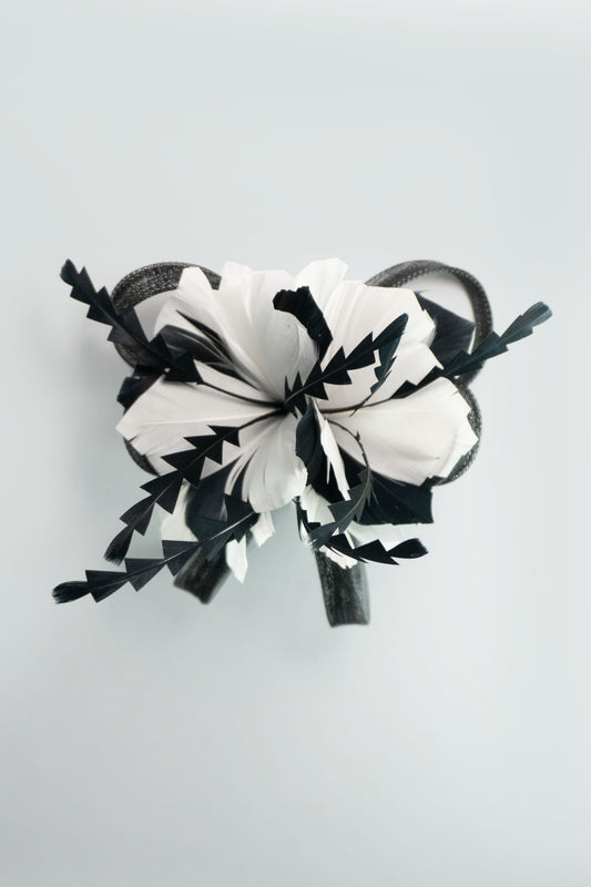 OLIVIA FASCINATOR CLIP BLACK AND WHITE