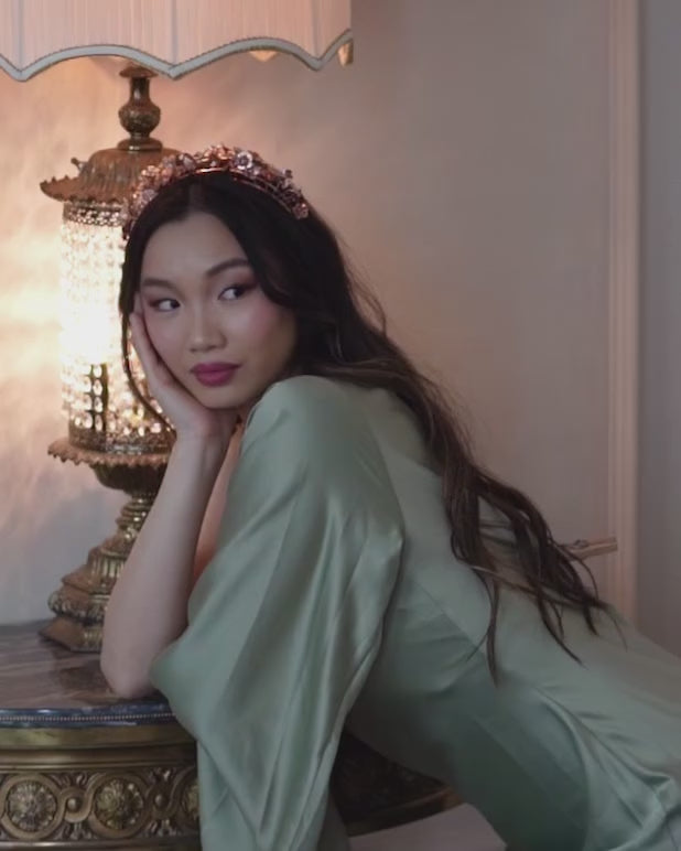 This rose-gold metal headband is adorned with tiny delicate flowers to intertwine within your hairstyle.