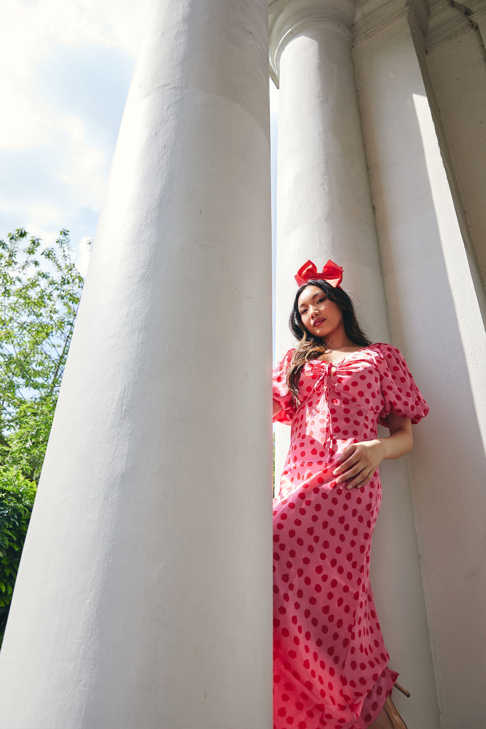 Our Gigi headband is both prim and playful. Beautiful 2-tone pink and red satin with an oversized bow, it delivers an instant upgrade to any occasion outfit.