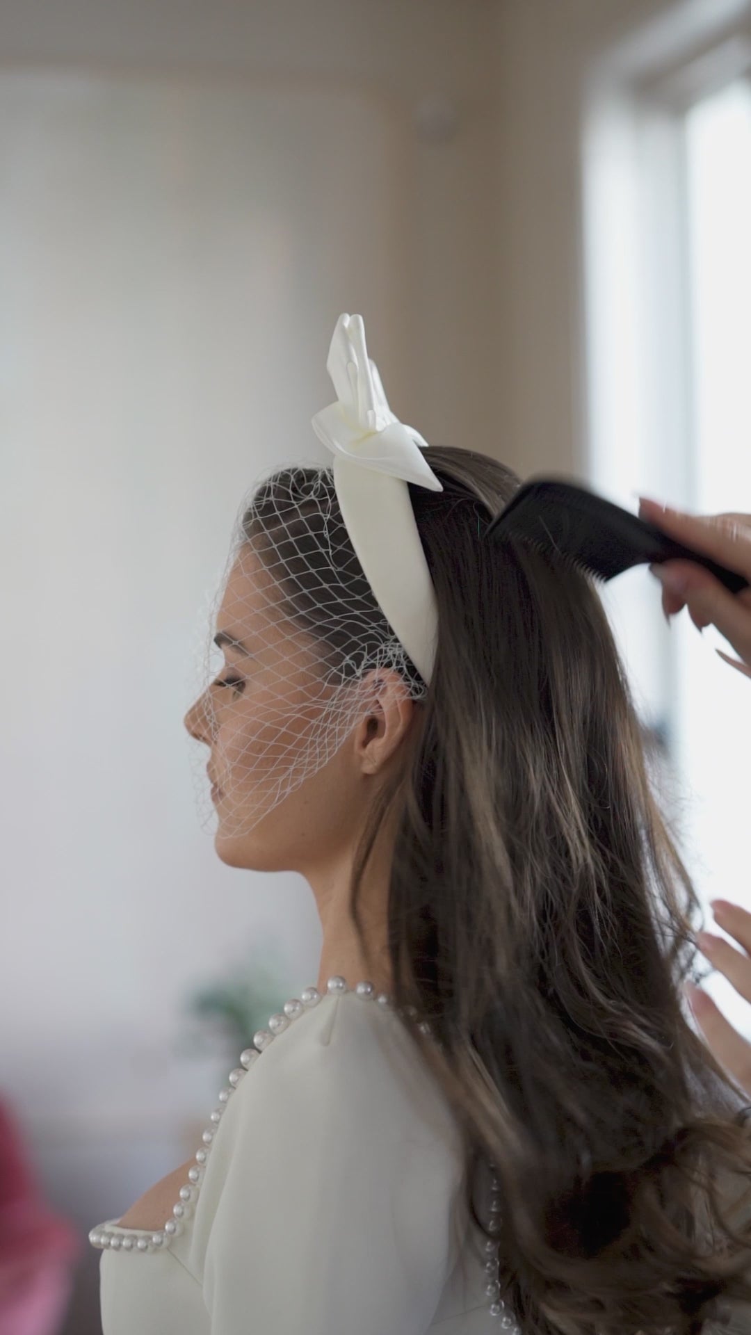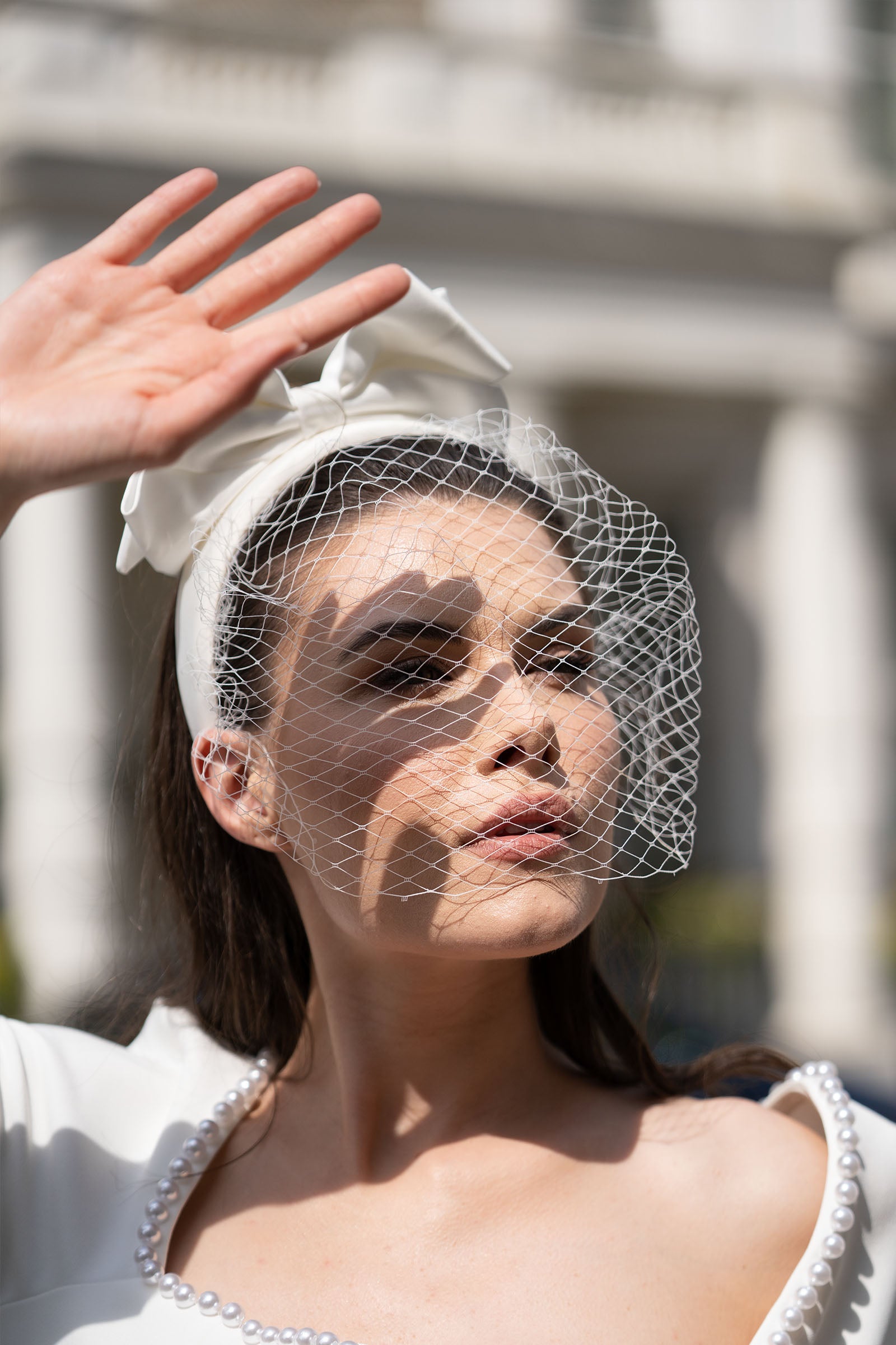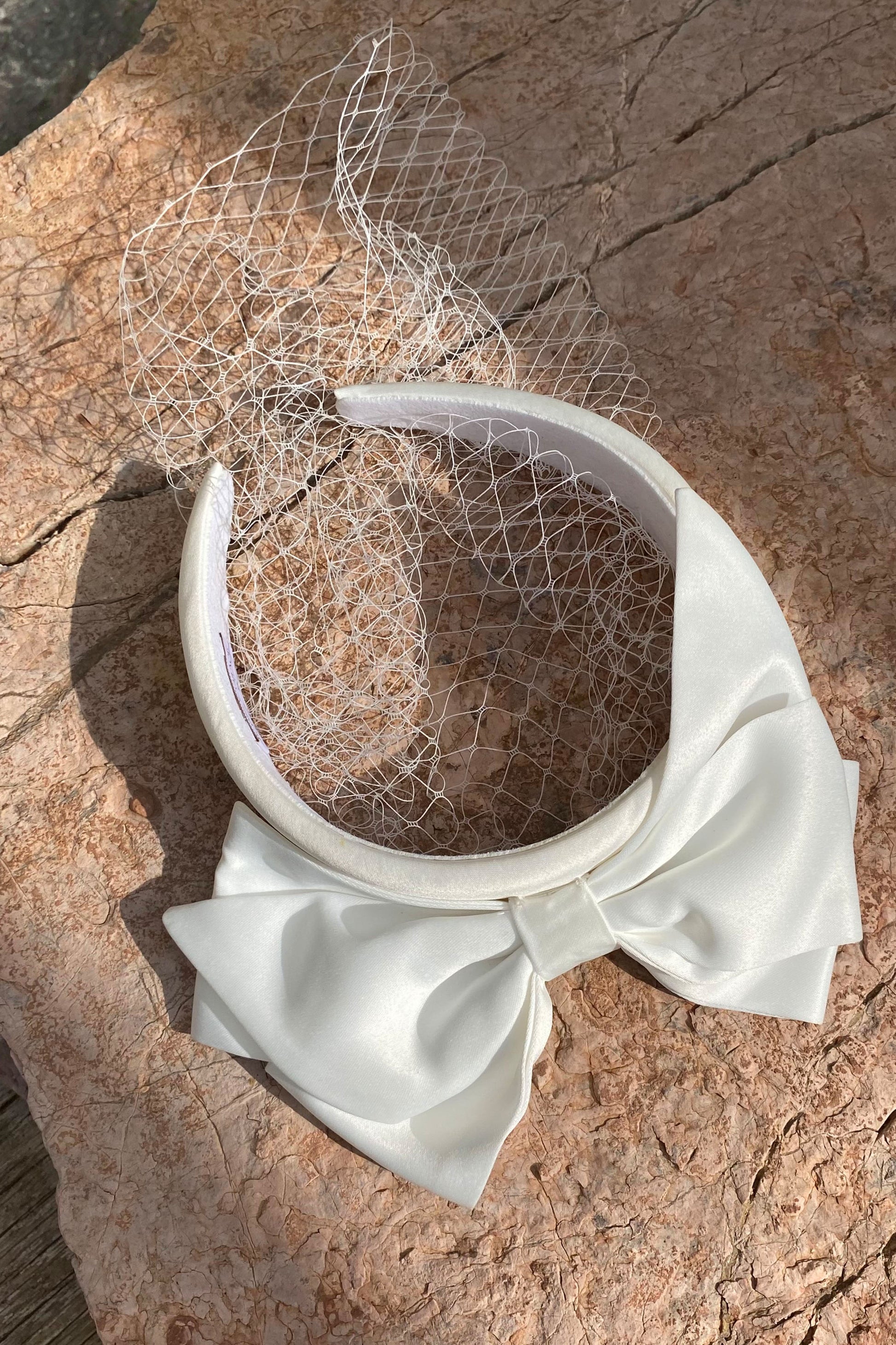 Our Gigi headband is both prim and playful. Beautiful ivory satin with an oversized bow, its perfect for any modern bride! Complete with a flattering voilette style overlay its the epitome of modern bridal elegance.