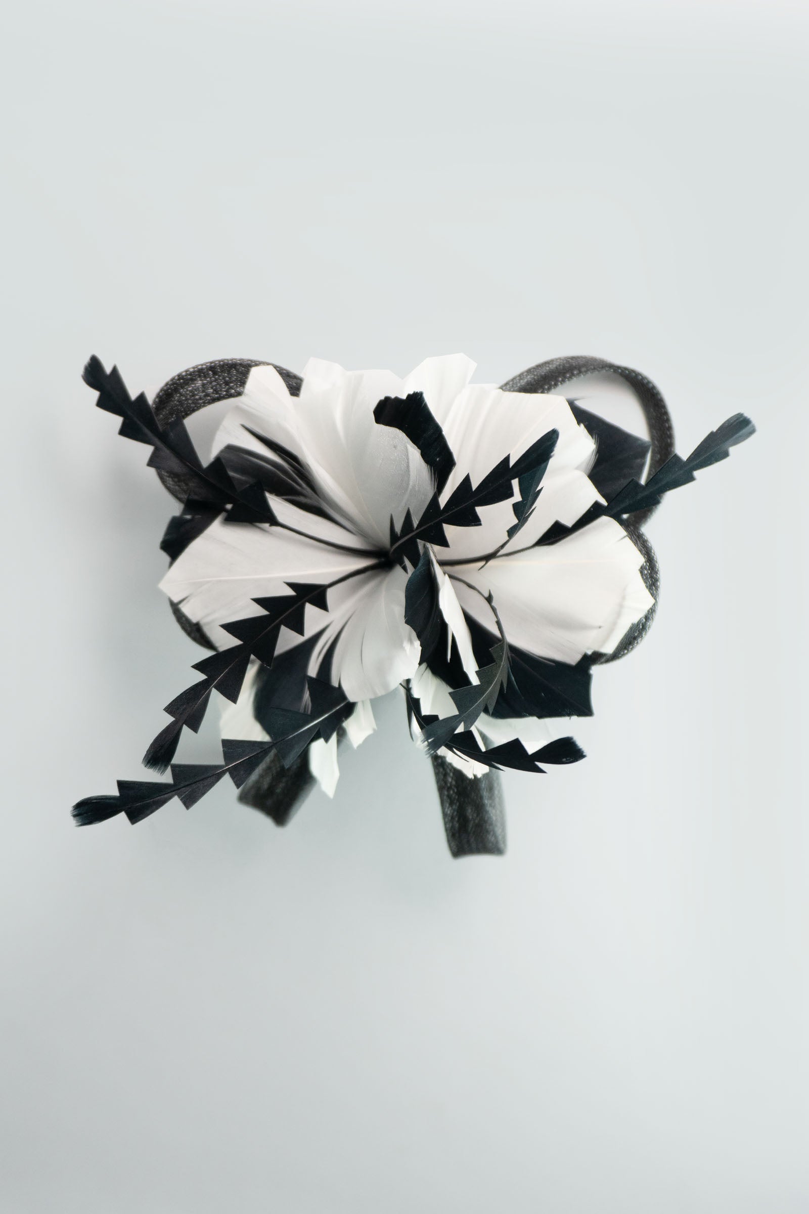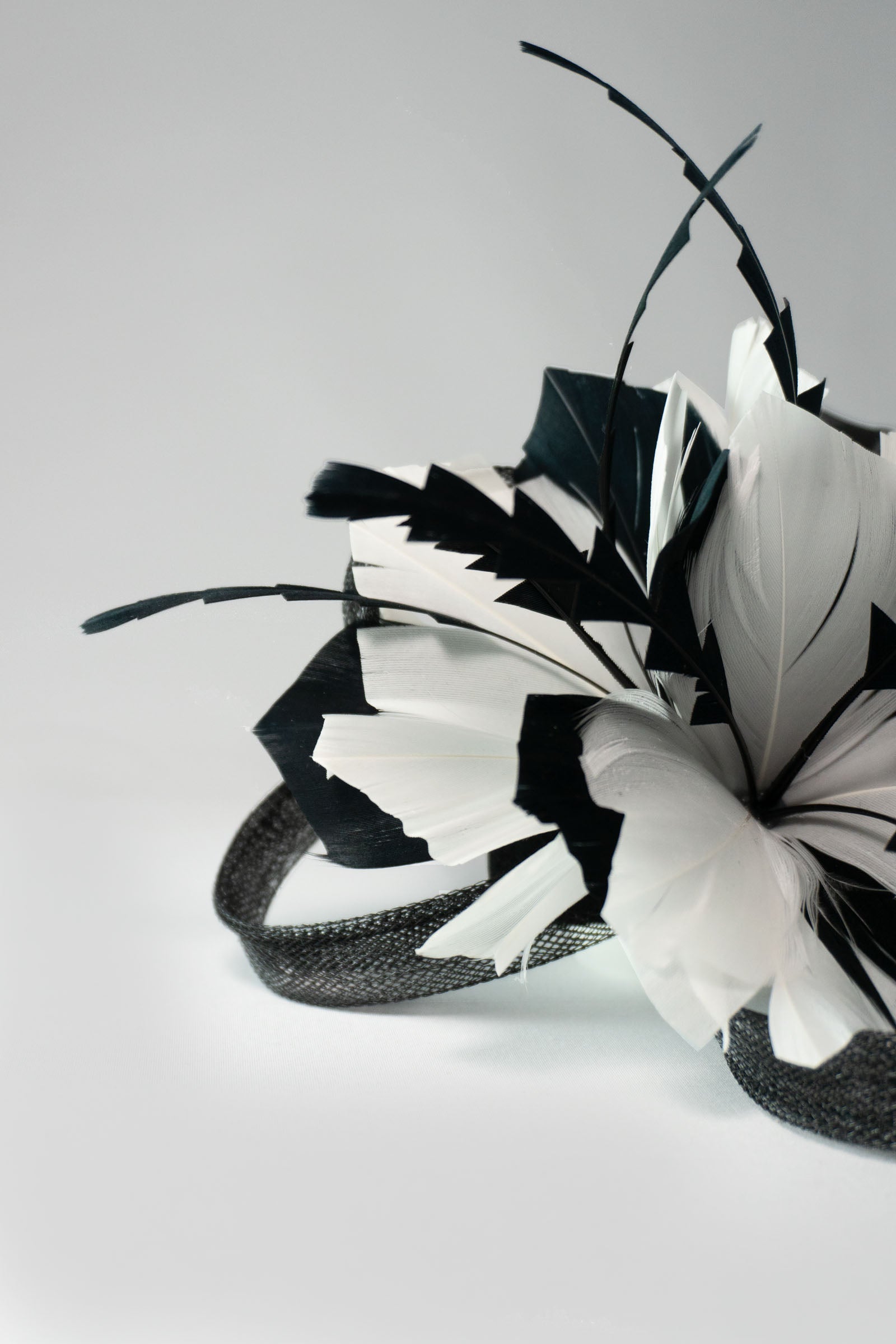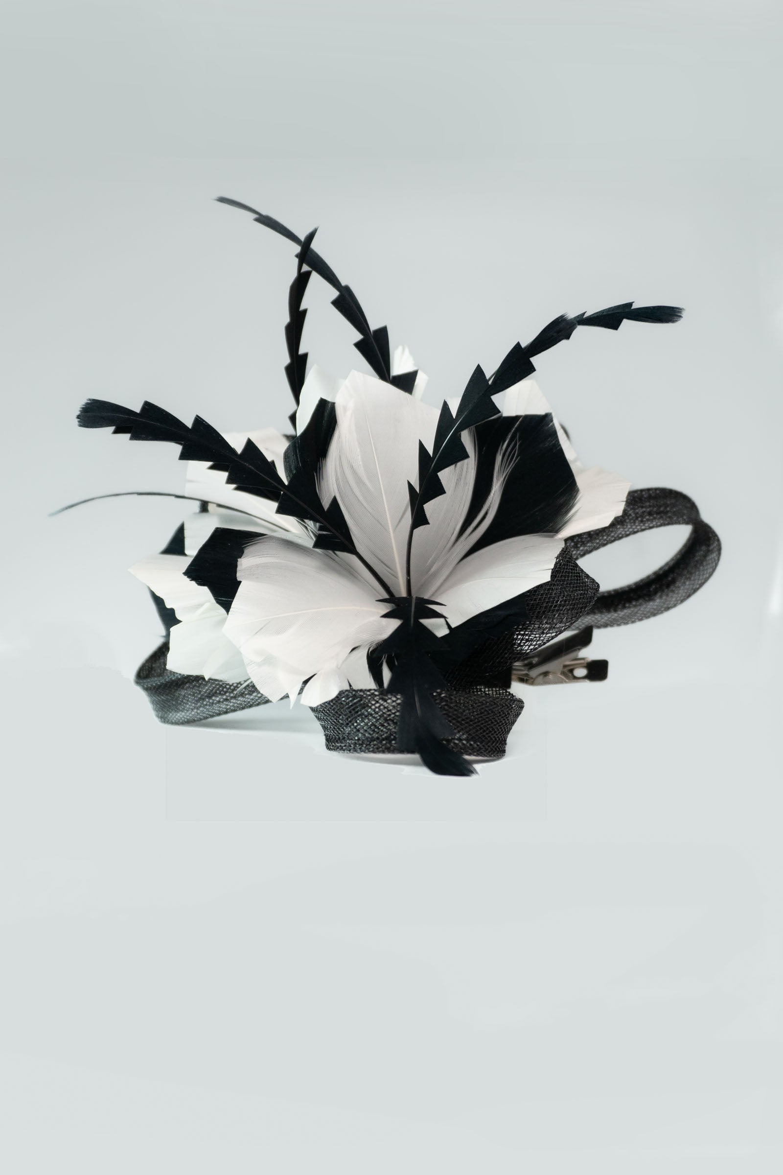 With black and white 2-tone colours and statement feathers, our Olivia clip offers a stylish update to the classic fascinator. The perfect addition for your wedding guest or race-day look!