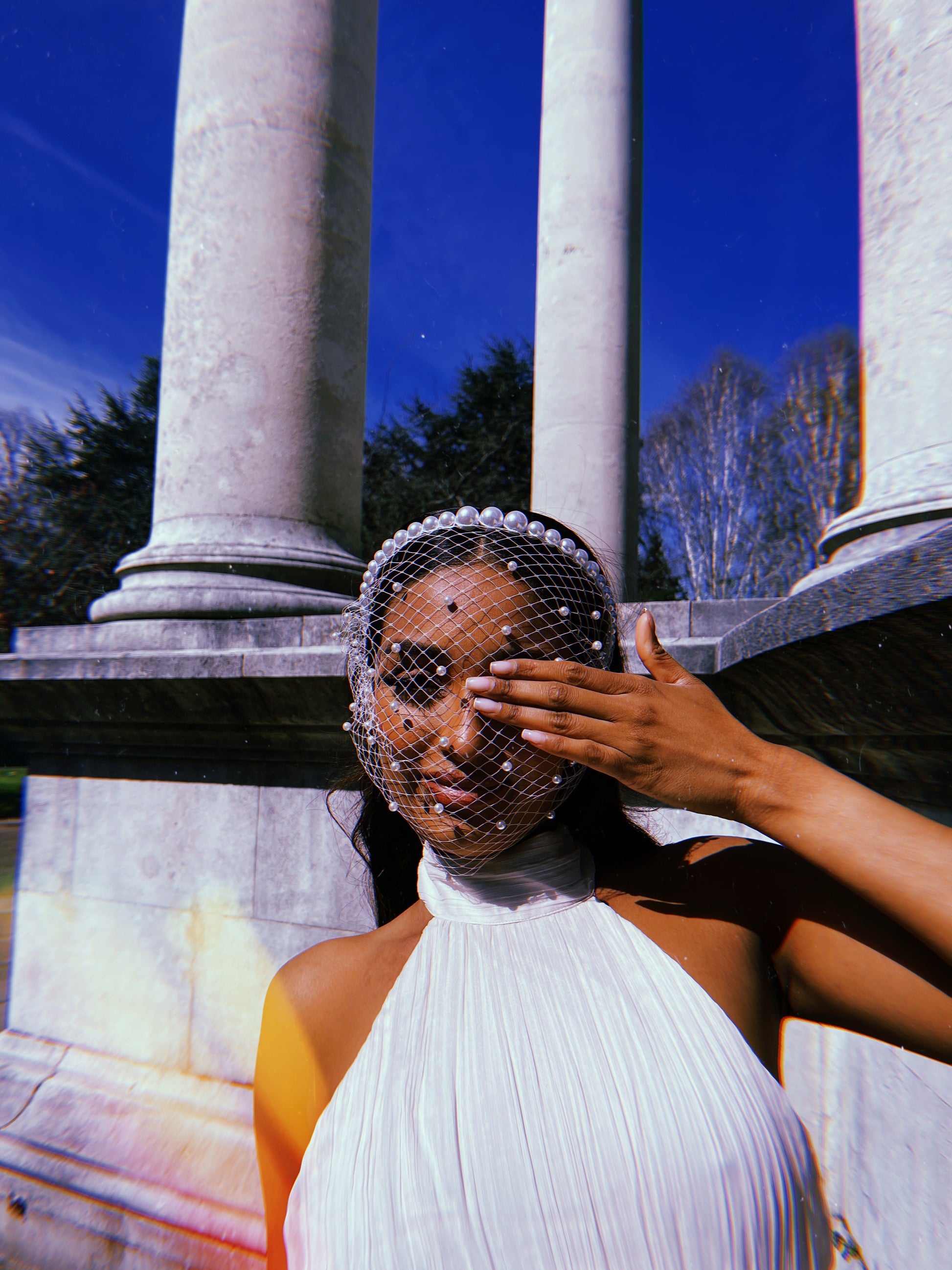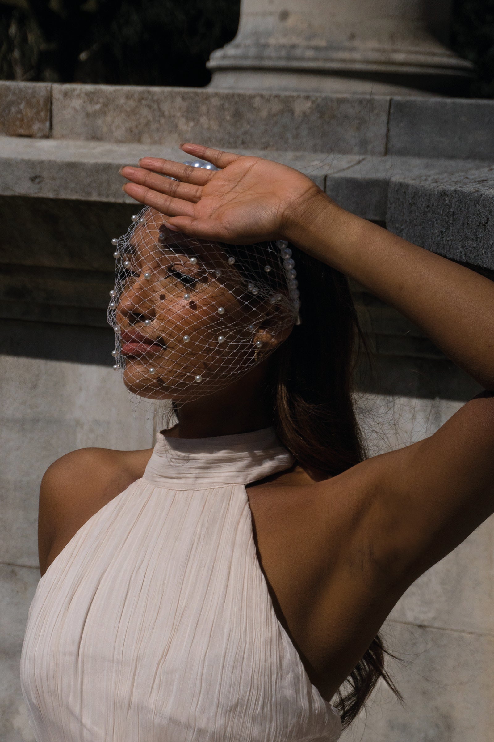 Our Paige Voilette headband is scattered with pearls, guaranteed to add some drama to your bridal look.