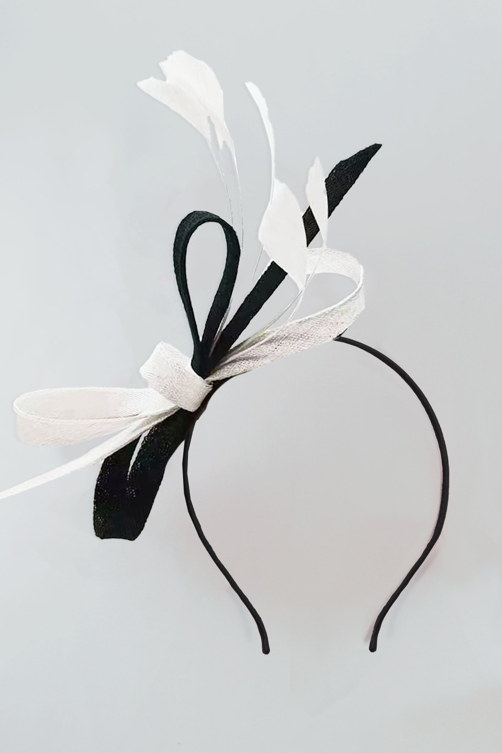 Featuring complimentary black and white two-tone colours and bold statement feathers, this fascinator adds a contemporary edge to timeless style. Perfectly crafted into a Sinamay bow , the Penelope fascinator is the ideal accessory for weddings, race days, or any special occasion.