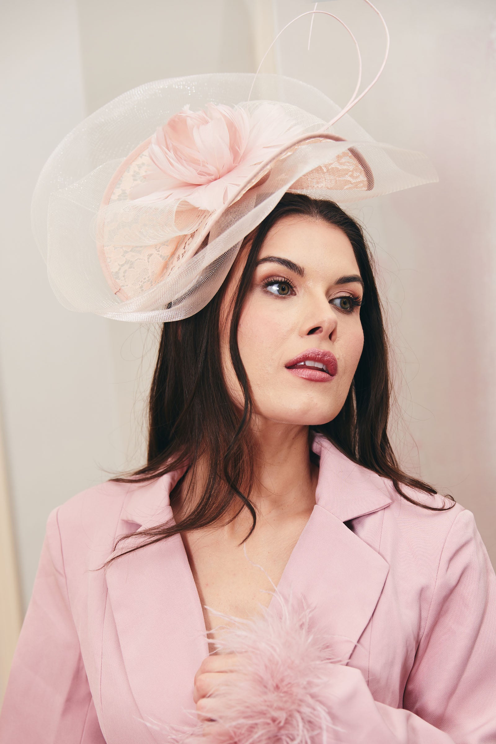 Delicately crafted with soft blush lace, this fascinator is the epitome of grace and sophistication. Featuring a gorgeous corsage detail, it adds a touch of elegance to your outfit. This fascinator is fitted onto a comfortable easy to wear headband.